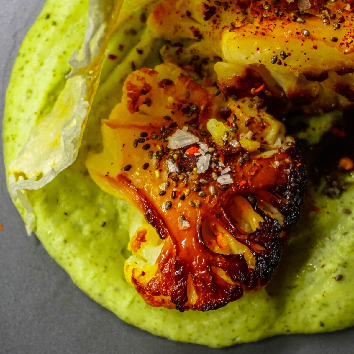 Füstölt karfiol, spenót pürével és sajtropogóssal