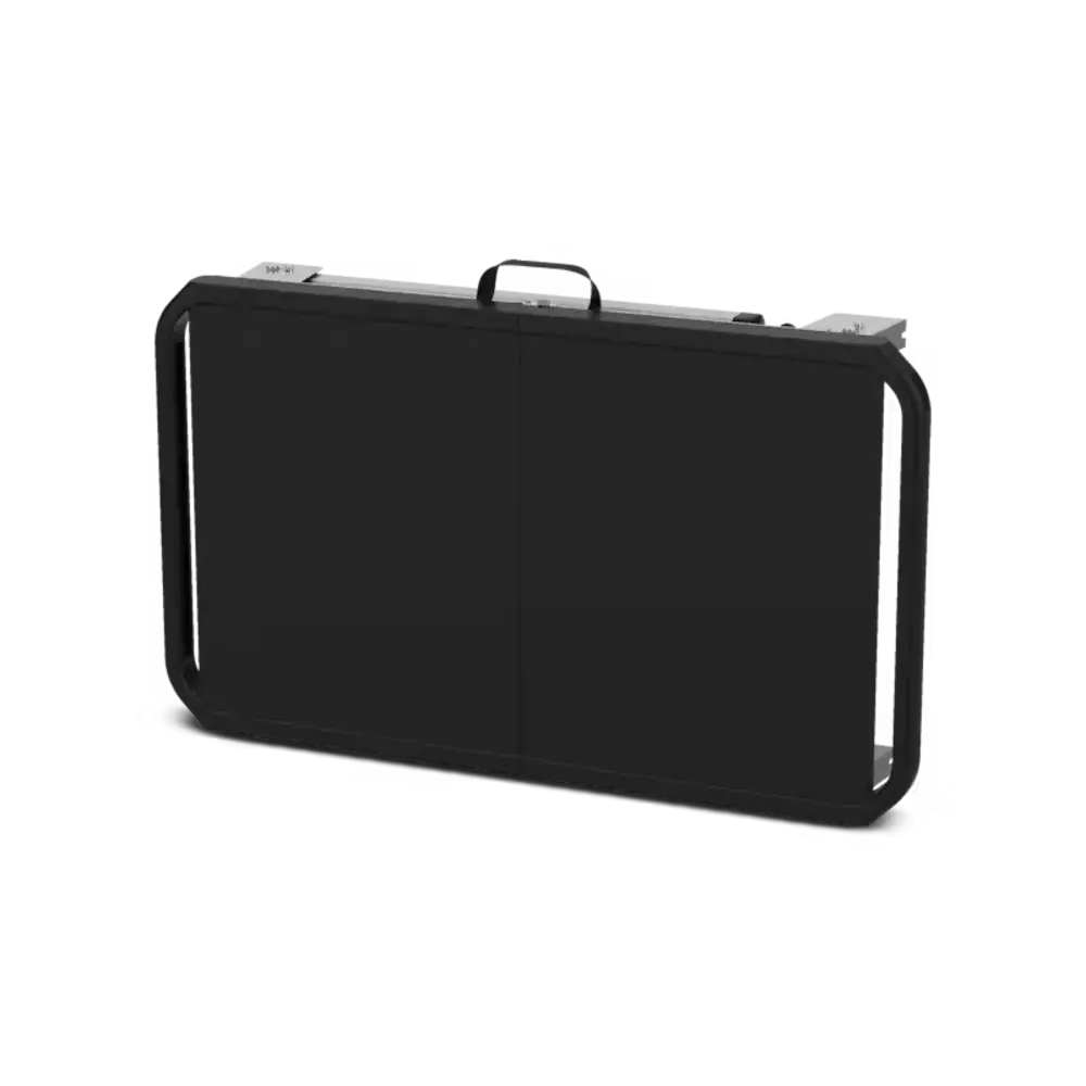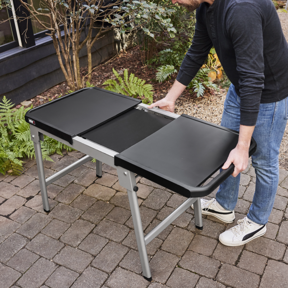 A kinyitható grillasztal könnyedén elfér az autó csomagtartójában, és bárhol egyszerűen összeállítható. Az állítható lábakkal ellátott innovatív kialakítás biztosítja, hogy a plancha egyenetlen felületen is stabilan és vízszintesen álljon. A Weber Works kiegészítők az asztal szélső fogantyúira rögzíthetők, így a grilleszközök mindig kéznél vannak. A két oldalsó asztal összetolható, így egy tálalásra ideális felület alakítható ki.