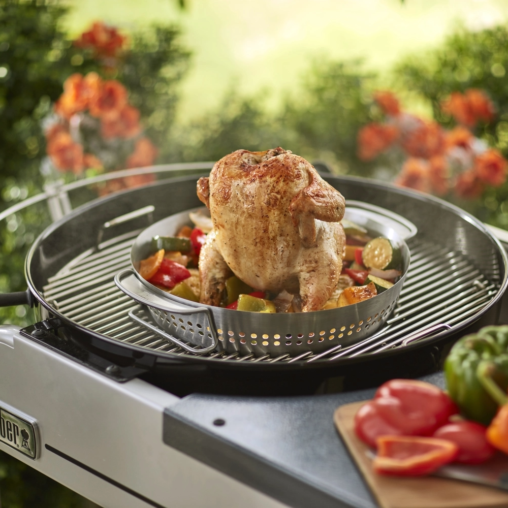 A Gourmet BBQ System szárnyas sütő sokoldalú, 2 az 1-ben kialakítása lehetővé teszi, hogy egyszerre grillezen csirkét és köreteket. A beépített folyadéktartály segít átitatni a csirkét, hogy az szaftos és még ízletesebb legyen. Az alaprészben elegendő hely van a zöldségek sütéséhez, a sütőn található lyukak pedig lehetővé teszik a hő behatolását és a zsír távozását.
